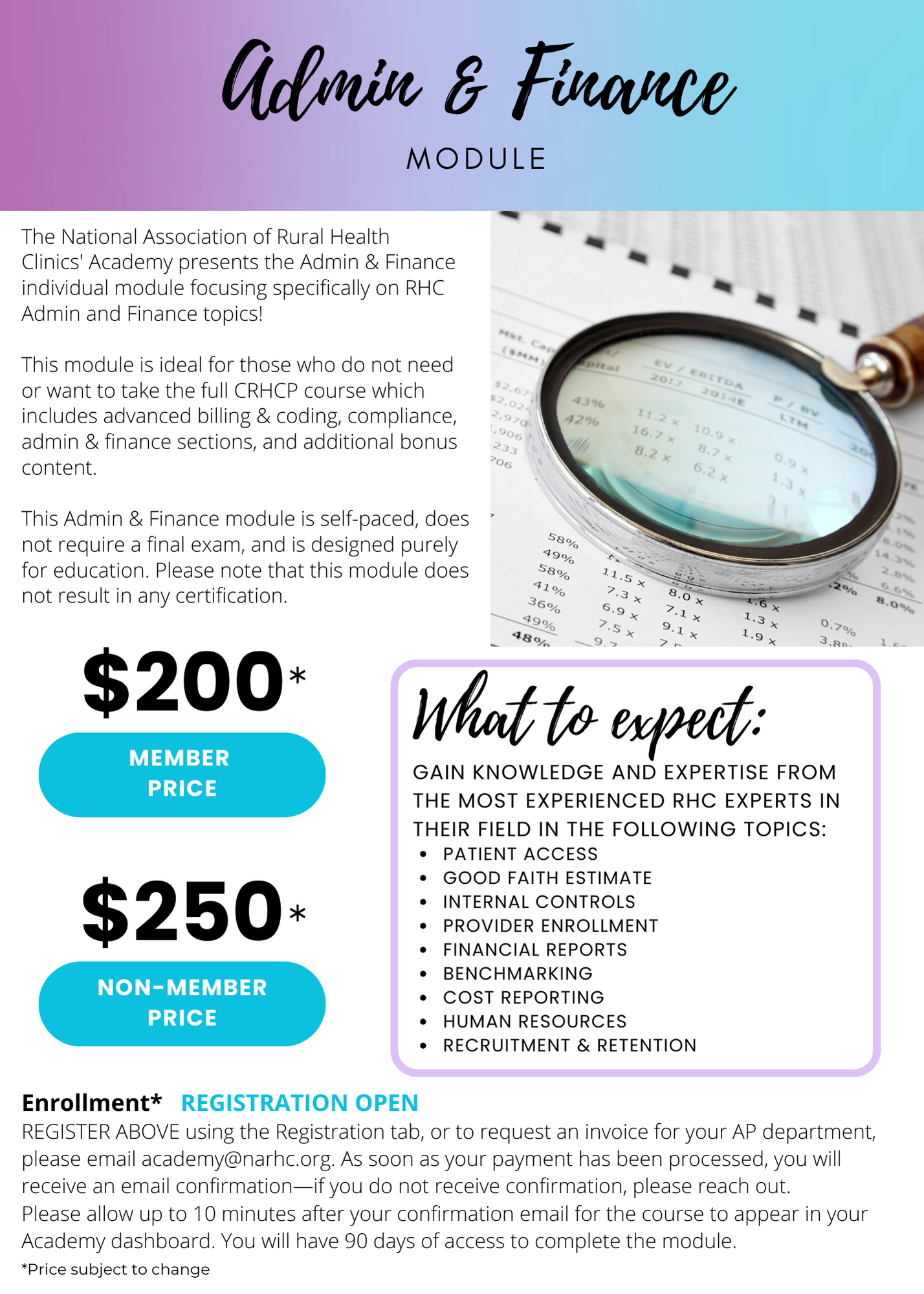 While there are no prerequisites required, we do highly recommend going through our Intro to RHCs course if you are brand new to RHCs or your role within a RHC. Registration is free to NARHC members and $50 for non-members.