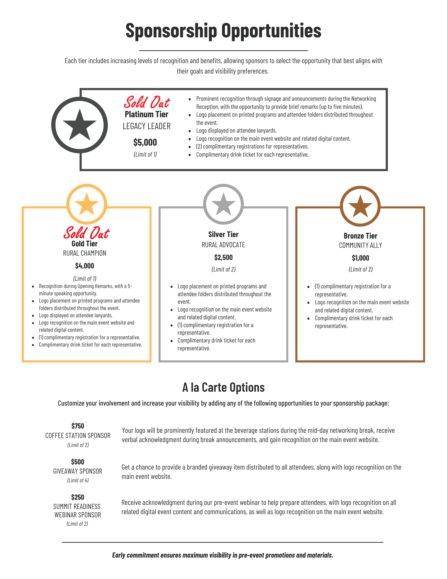 Silver Tier – Rural Advocate Sponsorship Includes: Logo on programs, attendee folders, and event website • (1) complimentary registration • Complimentary drink ticket for each representative | |